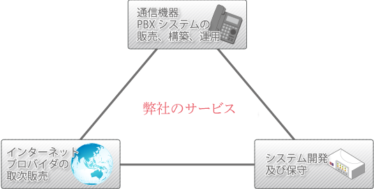 弊社は法人向けにPBXの販売を行っております。 主に中小企業をターゲットに販売展開しております。 また再販を含んだ販売代理店展開も行っております。 システム開発事業に関しては通信機器の販売先にシステム構築、開発を請負システムの保守も一部請け負っております。